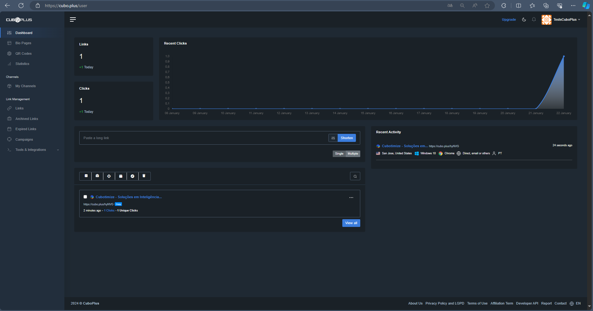 3.1 Welcome to your CuboPlus user area! Here, you can create links, QR Codes and personalized bio pages. Additionally, you can analyze the clicks of your campaigns.