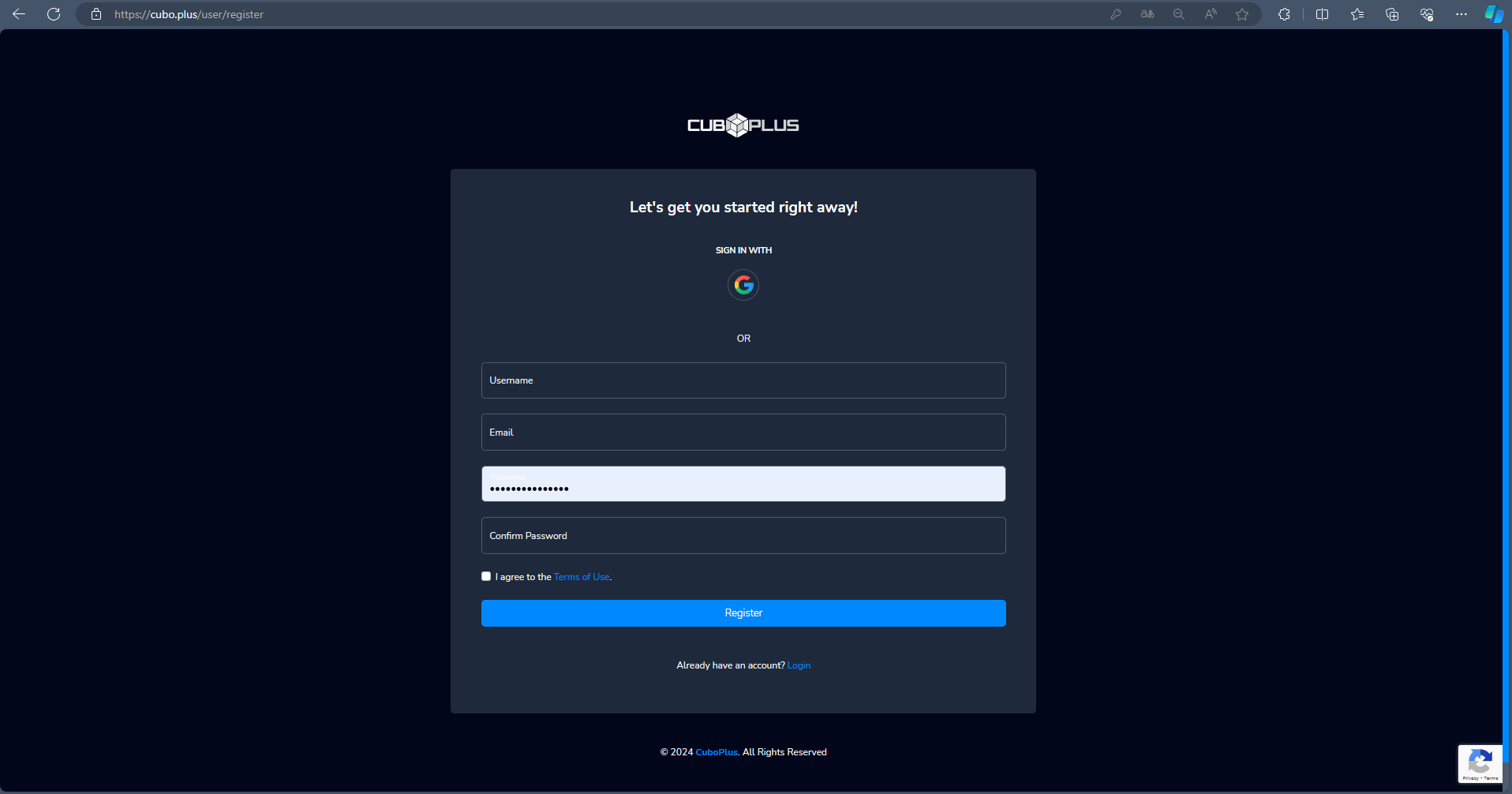 Important Tip: Read the Terms of Use carefully and check the option "I agree with the Terms of Use" to indicate your agreement with the conditions proposed by CuboPlus.